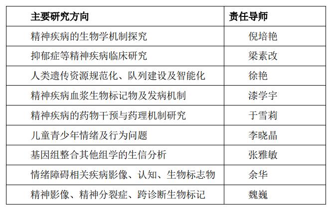 1. 倪培艳,副研究员,博士生导师。先后在四川大学华西医院、哈佛医学院McLean医院和纽约医学院做博士后。以(共同)第一/通讯作者在Molecular Psychiatry、Advanced Science和Psychological Medicine等领域内高影响力杂志上发表SCI论文20余篇,主持国家自然科学基金3项、省部级课题4项,以及其它课题共计10余项。研究方向为iPSCs及脑类器官模型在精神疾病发病机制和新型药物筛选中的应用,常见精神疾病动物模型的建立及其在精神疾病发病机制中研究和应用,常见精神疾病的客观生物学标记及其临床转化研究。
