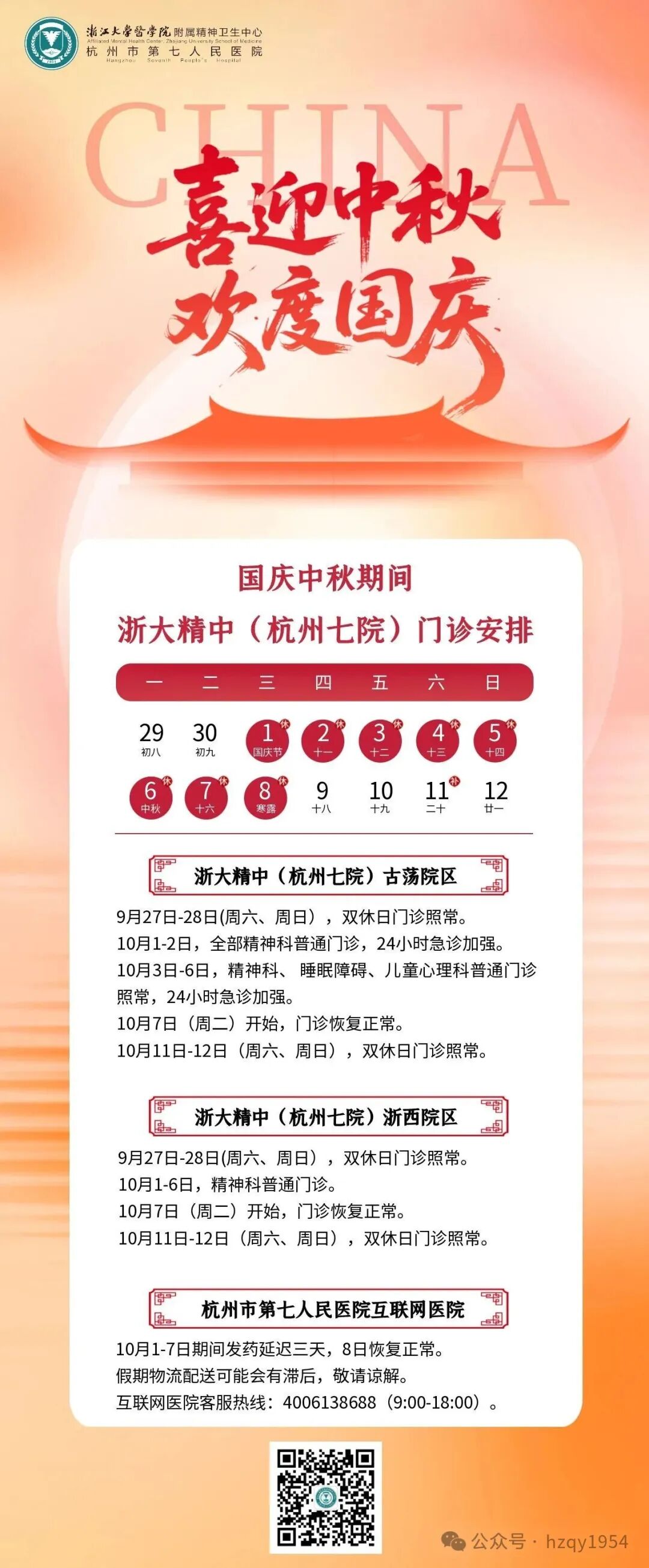 重要通知 | 浙大精中(杭州七院)2025年国庆假期门诊安排